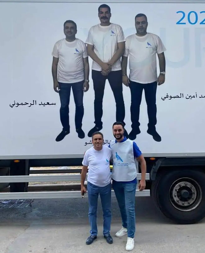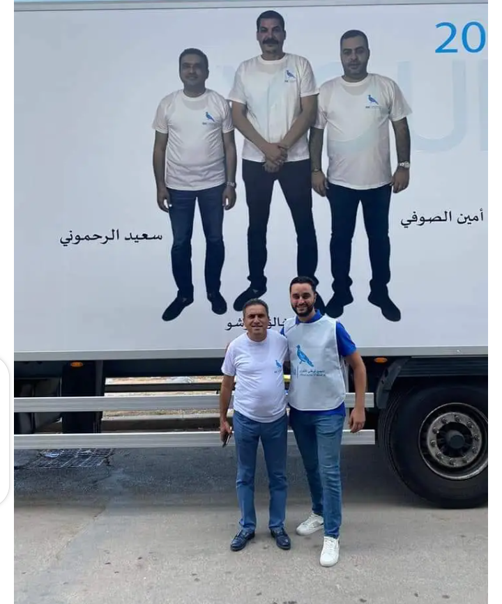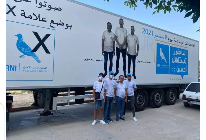 قام سعيد الرحموني بتعليق لافتة عملاقة متنقلة، تحمل رمز “الحمامة” وصور وكيل لائحة حزب التجمع الوطني للأحرار إلى جانب وصيفه.